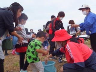 4年ほど前から受付からいも堀りまでの時間が30分以上あり参加者が退屈しているのに何も策を施していなかったので順に改善してきました。今年の目玉は、シャボン玉、エコキャップアートです。毎年工夫して頑張っています。より良いいも掘り大会になるよう今後も企画していきます。