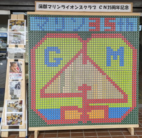 いつも同じことをするのではなく、知恵を絞った何か違うアクティビティを毎年一つしたいとの思いで、ペットボトル(エコキャップ)の蓋を使ったモザイク絵を作成してみました。1.8m四方の正方形でキャップ2500個をはめることができます。デザインについては、赤の外枠とヨットを、蒲郡の「G」、「M」をシンメトリーに配置しました。作成にはガールスカウト(GS)にお願いしいも堀り大会の展示用として10/8蒲郡公民館にて行いました。初めてのことなので、出来栄えを心配していましたが、思ったより良いものとなりました。そこで、いも堀り大会後すぐに壊すのももったいないと多くの方から言っていただけるので市役所に問い合わせたところ、11/1~11/30玄関出入口に展示しました。11/16模様替えとしてGSの図柄に変更しました。今後は、デザインを変えながら毎年環境保全に訴えるためにも展示していきたいと思います。
