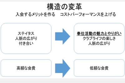 「退会者の多くは、奉仕する醍醐味を知らない人達です。」は本当でしょうか。総じてステータスの有るLCに入会したけれども、ほとんど金銭の奉仕でマンネリ化していて達成感がなく継続して会員である意義が感じられない。年会費分はゴルフを10回した方がましだと思っていしまうのではないか。そして、従来の会社経営者の会員候補はまだ多くおられると言い、そして、お金の奉仕ではないボランティア活動される方を別組織で取り込む必要があると言われる。まったく上から目線の言葉で残念です。