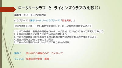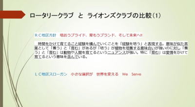 その中で、「会員拡大とクラブ活性化」の題目で岩田前ガバナーが講義されました。その資料をスクリーンでお見せし、私なりの回答をお話しします。